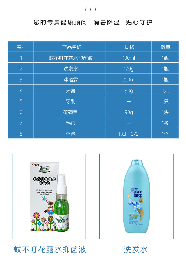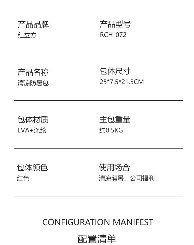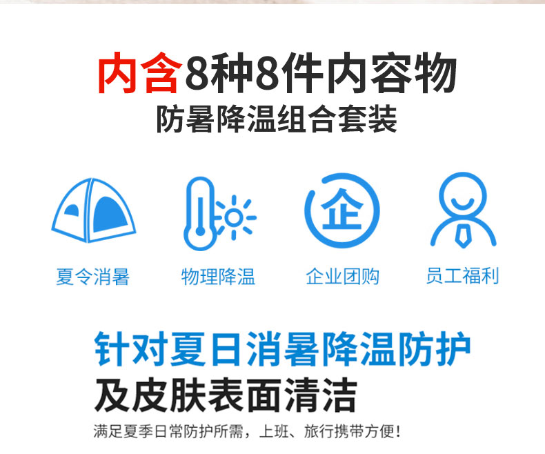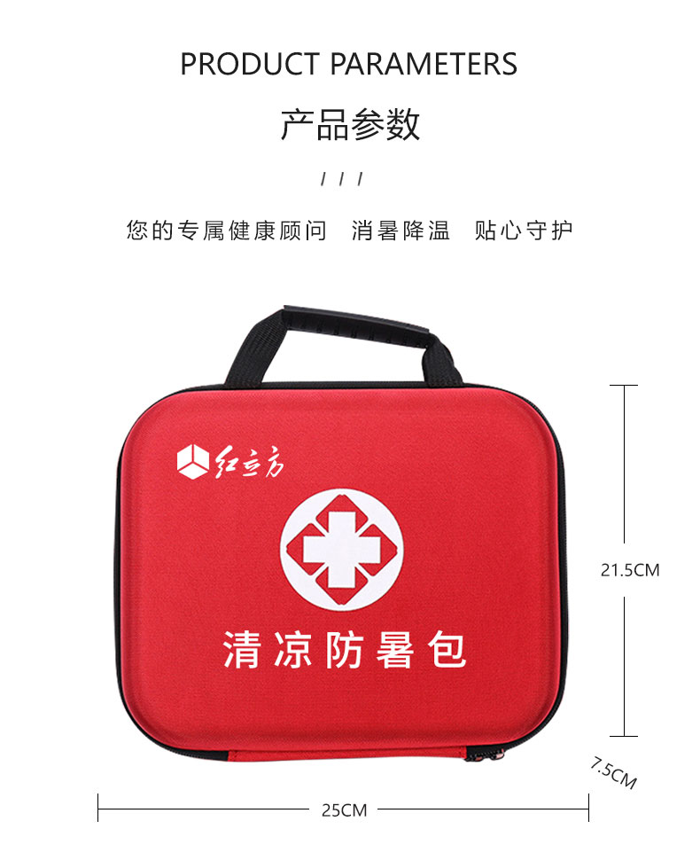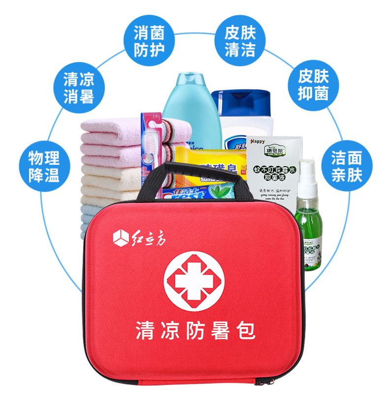 紅立方始終秉承著“讓我們生活地更安全”理念,為應對暑伏安全,特研發清涼防暑包套裝,內含物理降溫,清涼防暑,潔面親膚,消菌防護,皮膚清潔抑菌等產品。包體便于攜帶,方便戶外時使用,可定制logo。適用于員工福利發放,客戶禮品饋贈,個人家庭使用。