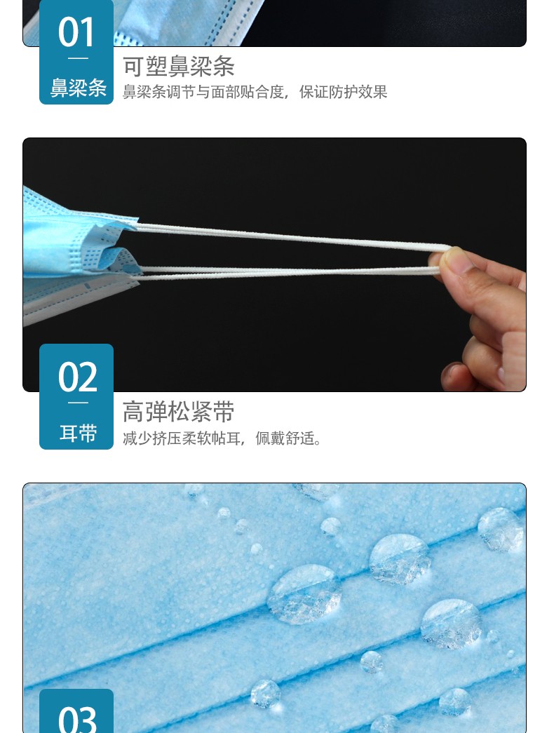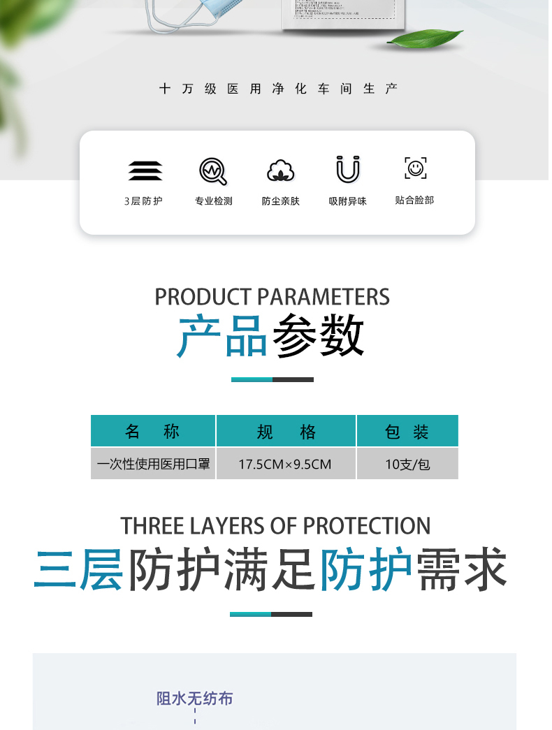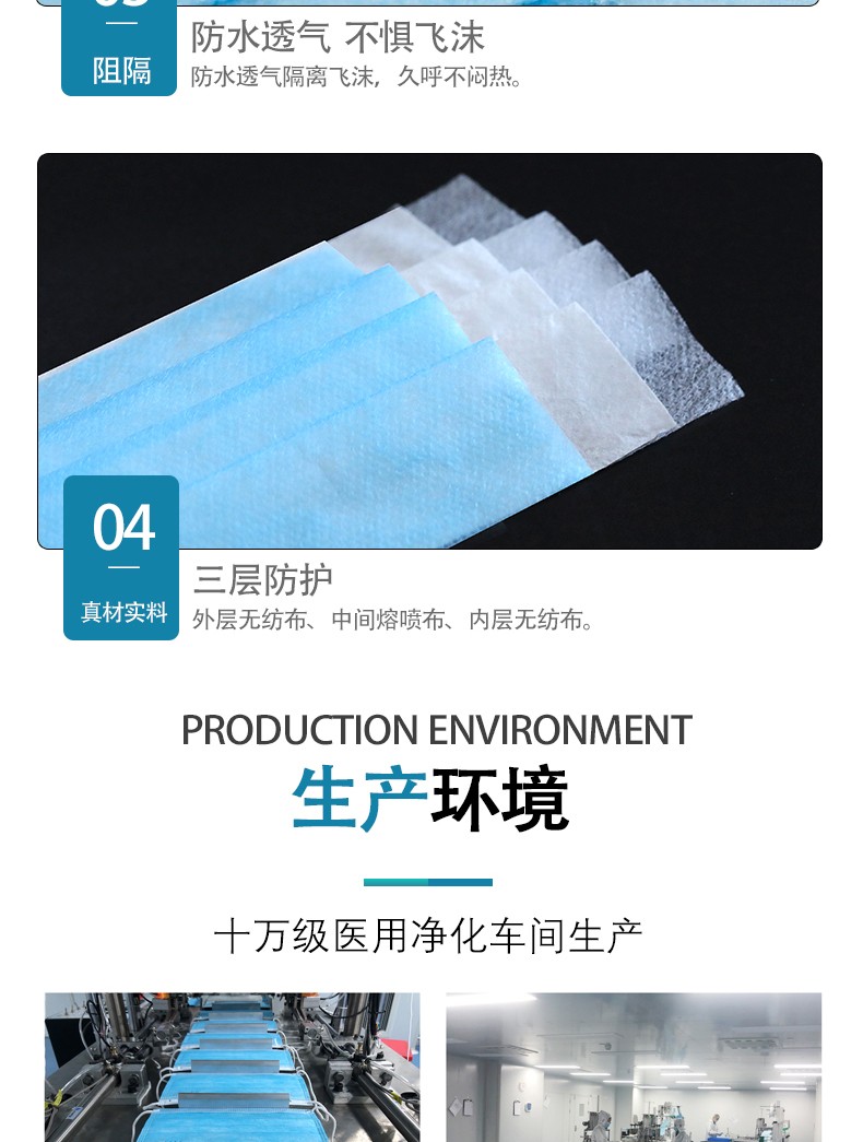 【結(jié)構(gòu)組成】一次性使用醫(yī)用口罩由口罩體、鼻夾和口罩帶組成,口罩體由無(wú)紡布和熔噴布制成。一次性使用醫(yī)用口罩在10萬(wàn)級(jí)潔凈間生產(chǎn),未經(jīng)消毒處理微生物指標(biāo)符合技術(shù)要求。