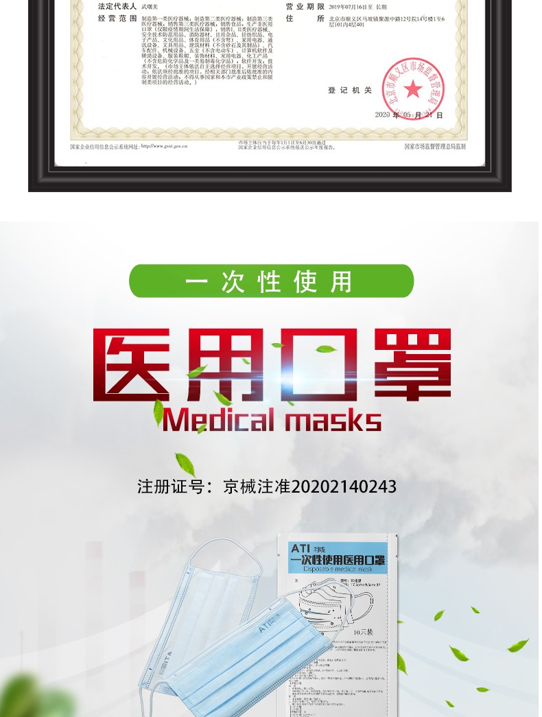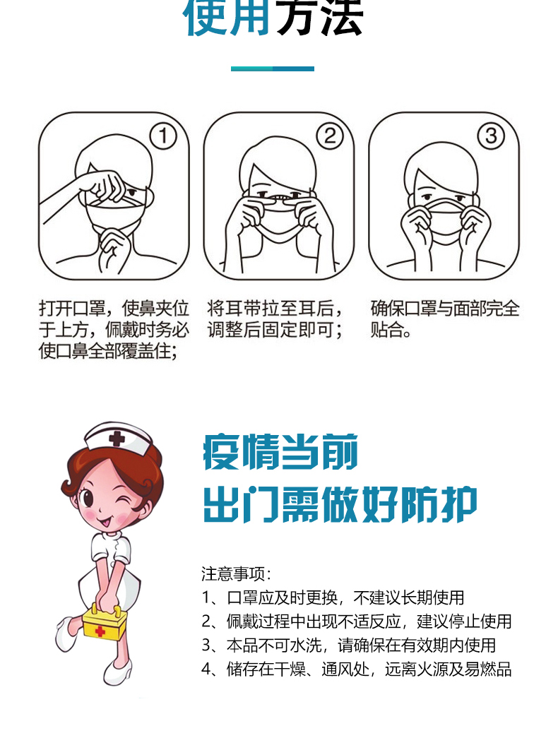 【適用范圍】一次性使用醫(yī)用口罩適用于佩戴者不存在體液和噴濺風(fēng)險(xiǎn)的普通醫(yī)療環(huán)境下的衛(wèi)生護(hù)理。