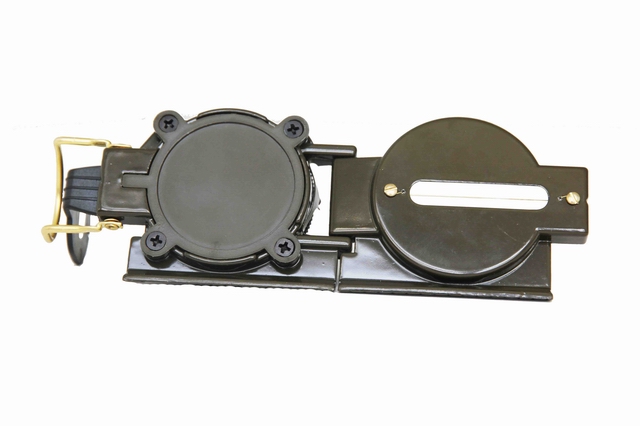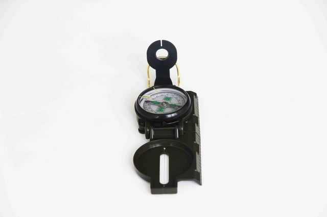 1.測方位角:展開指北針,轉動方位框使方位玻璃上的刻度線與方向指標相對正,將平視鏡斜放(45°)單眼通過準星瞄向目標,從平視鏡反射看到磁針N極所對反字表牌上方位分劃,既可讀出目標方位角,然后用右手轉動方位框使方位玻璃上的刻度線與磁針N極對準,此時方向指標與方位玻璃刻度線所夾之角即為目標方位角(按順時針方向計算)。打開指北針,標定好地圖(測距時可不標定地圖),在圖上基準點處插一扎針,轉動指北針,使側尺邊切于目標點,即可判讀出基準點至目標點的方位角。
