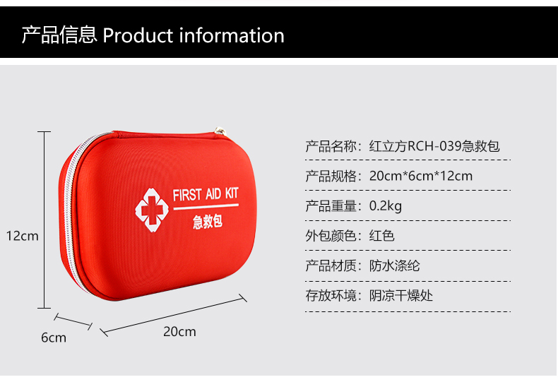 型號:RCH-039急救包 | 材質(zhì):高強度防水滌綸 | 顏色:紅 | ||||||