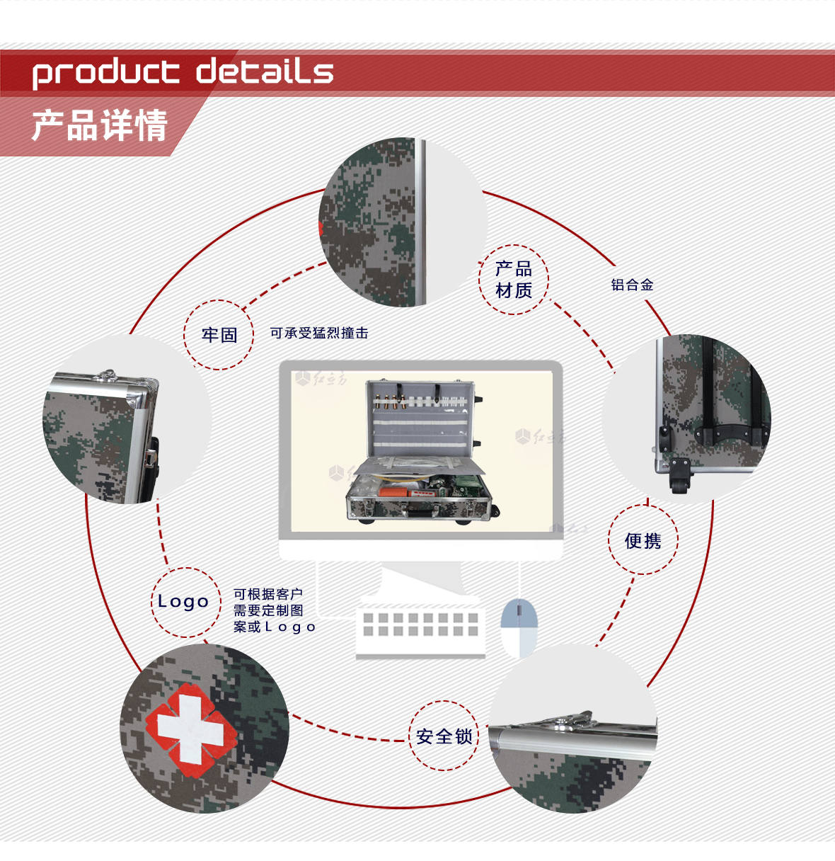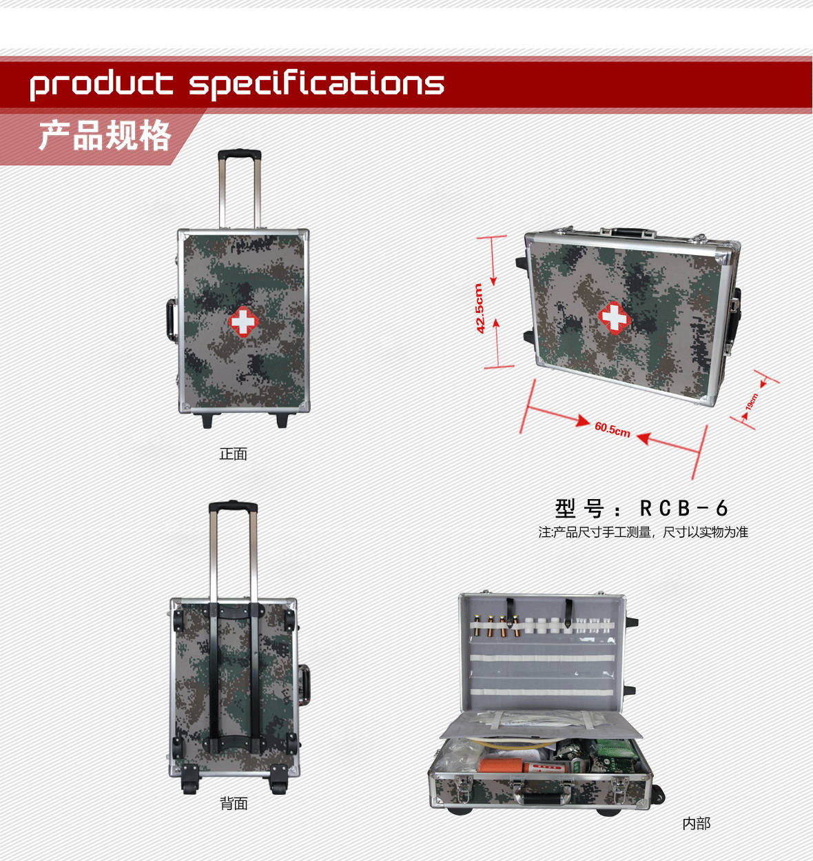 型號:RCB-6拉桿型急救箱 | 材質:鋁合金 | 顏色:迷彩 | ||||||