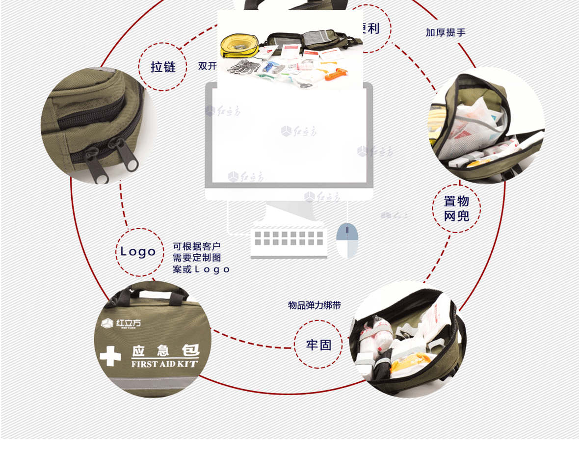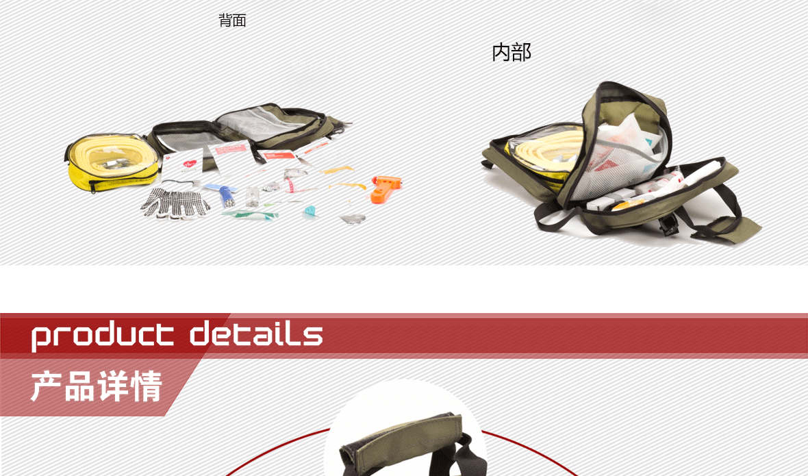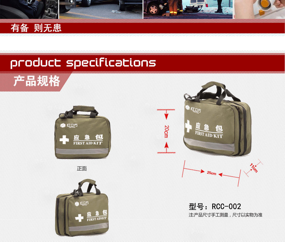 型號:RCC-002車載標準型應急包 | 外包:滌綸 | 顏色:紅、綠 | ||||||